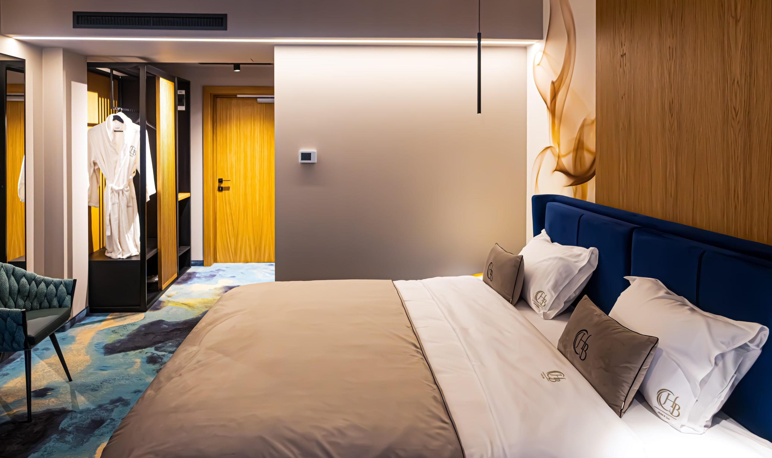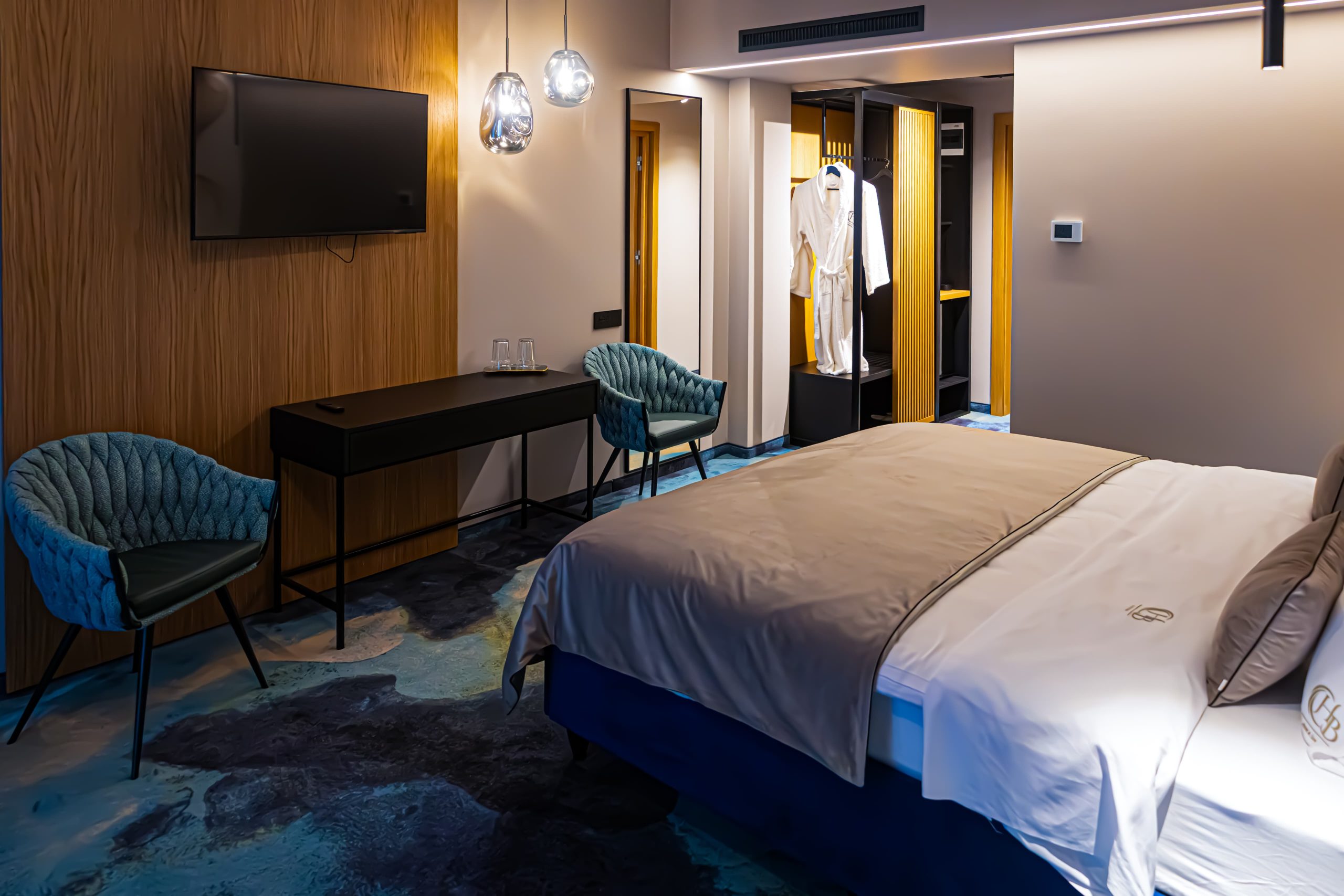 Fiecare detaliu este gândit pentru confortul dumneavoastră. Aerul condiționat menține temperatura perfectă, în timp ce televizorul LCD cu cablu și Wi-Fi gratuit vă asigură divertismentul și conectivitatea. Pentru un plus de confort, aveți la dispoziție halate și papuci, alături de facilități precum minibar, seif, și un filtru de cafea pentru a vă bucura de momentele de relaxare în intimitatea camerei.